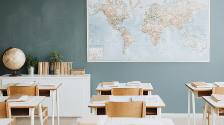 Bright classroom featuring a world map and globes, emphasizing geography and education. A serene environment ideal for learning and exploration.