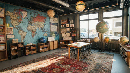 Bright and inviting classroom featuring colorful world maps and globes. Ideal setting for creative learning and exploration of global cultures and geography.