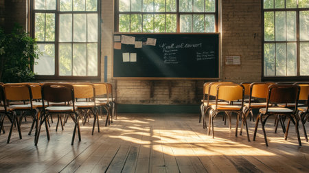 A serene classroom scene featuring wooden chairs and a chalkboard illuminated by natural light, ideal for educational themes and creative learning environments.