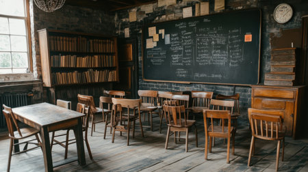 A captivating vintage classroom scene featuring wooden furniture, a chalkboard filled with writings, and traditional decor, perfect for themes of education and nostalgia.