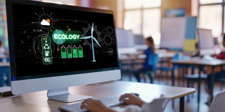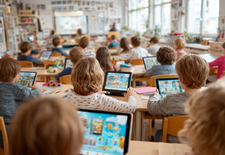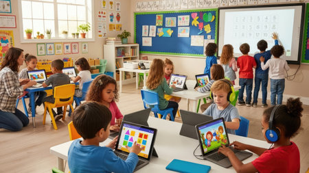 An interactive classroom scene shows students engaged with modern educational tools. Bright lighting illuminates the space, featuring a teacher guiding children near tables with computers and interactive surfaces. The environment promotes active learning with the use of advanced technology. Suitable for educational and commercial applications.