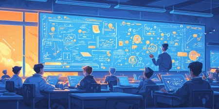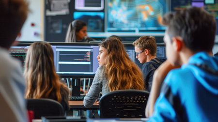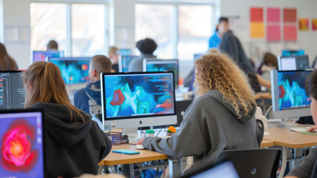 Diverse classroom of young adults engaged in interactive technology learning session. That the image is generated using AI.