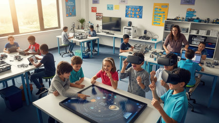 Children are actively engaged in learning activities within a modern classroom. The image showcases a diverse group of students interacting with technology, including virtual reality headsets and interactive displays. The scene is brightly lit with natural light, suggesting an encouraging and productive atmosphere. Suitable for educational and promotional materials.