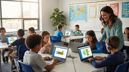 A group of students, along with a teacher, are engaged in learning with laptops in a bright classroom. The scene displays a variety of colors, featuring technology and educational tools. Suitable for educational and commercial projects, the image can be used to represent learning and digital resources.