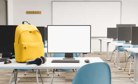 mockup of a pc monitor on a desk in a classroom with a backpack and headphones next to it. concept of education and back to school. 3d render