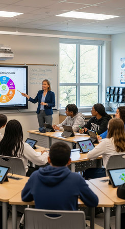 A female teacher actively engages with students in a contemporary classroom setting, utilizing an interactive whiteboard for a presentation while students work on tablets and laptops at their desks, .
