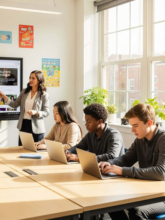 A teacher stands in front of an interactive whiteboard, guiding a group of students seated at desks with laptops, in a well-lit classroom with educational posters and plants.