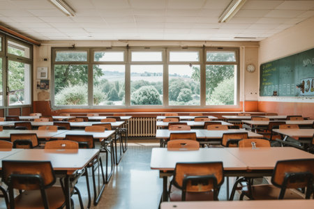 Rows of wooden desks stand in an empty classroom, illuminated by natural light from large windows, conveying a sense of calm and anticipation for the school day ahead.
