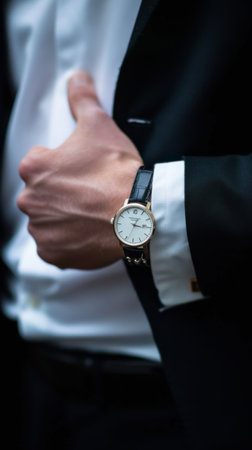 With a casual thumbs-up gesture, a dapper individual highlights a sophisticated timepiece on his wrist, dressed perfectly for a classy event in a relaxed outdoor setting.