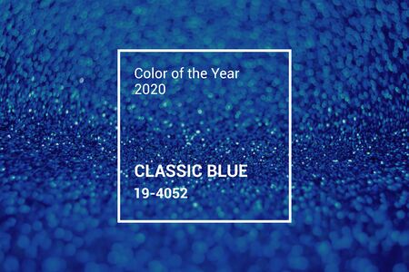 Lights on blue defocus background. Holiday christmas beautiful abstract bokeh background with copyspace Winter festive shine sparkle glitter macro concept in trendy classic blue color of the year 2020