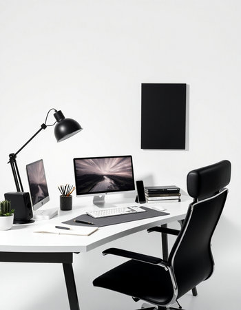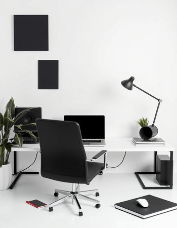Interior of modern office with black and white walls, concrete floor, white computer desk, black chair and lamp. 3d render