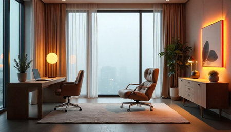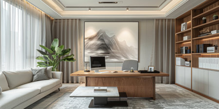 Panoramic view of home office in modern house with contemporary interior design, work desk, lampstand, comfortable couch and wooden rack for decor