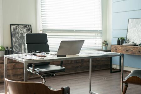 Modern office interior design with office chair and desk in front of windows. Workplace with laptop.