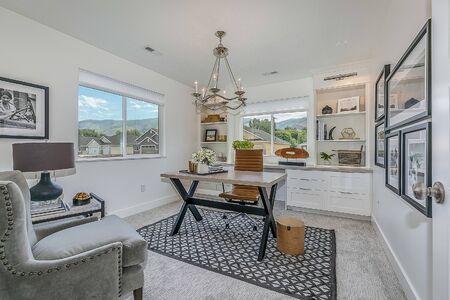 Bright, minimalist home office with white furniture, large windows, and a calming atmosphere.