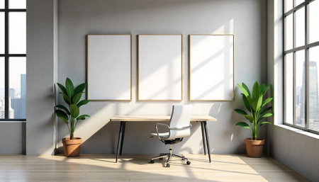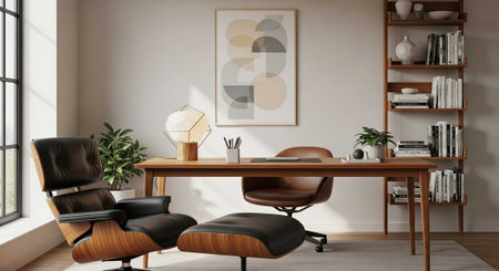 modern home office with wooden bookshelves, bright natural light, lush green potted plants, and an ergonomic chair, creating an inspiring and productive workspace.