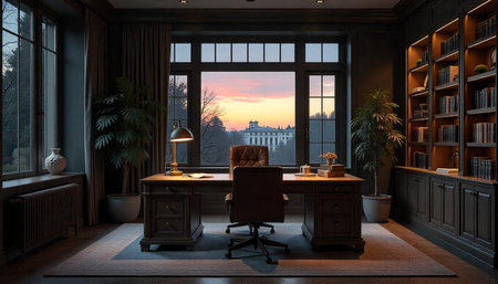 Empty spacious office fully furnished, computer monitor and potted plants on desk, dimly lit workspace