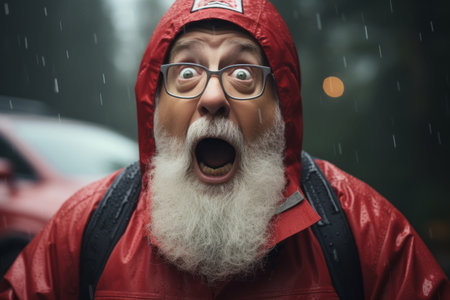 A cheerful elderly man embraces the holiday spirit with his white beard, glasses, and Santa hat, radiating joy and warmth in a festive portrait.
