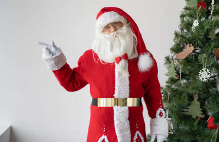 Santa claus stands near the Christmas tree with his forefinger shows an empty space for the text