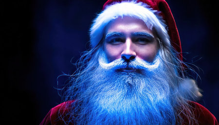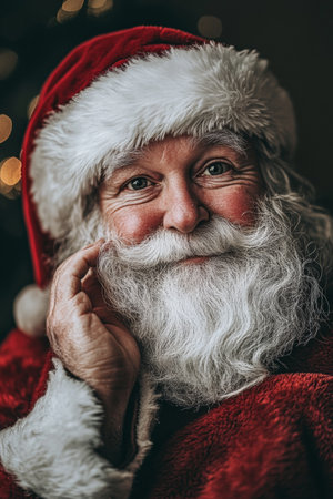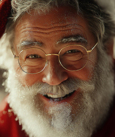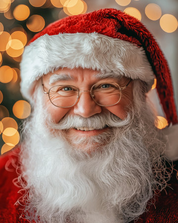 A jolly Santa Claus, dressed in traditional red attire, smiles warmly with twinkling eyes. He poses with a festive background, capturing the spirit of Christmas joy.