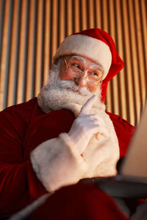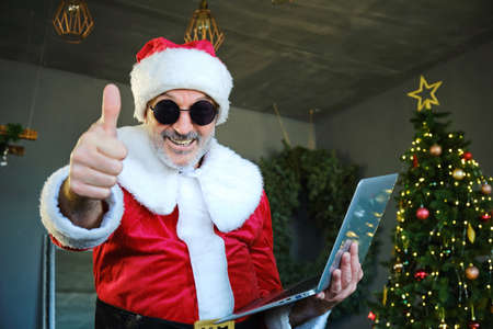 Cheerful Santa Clau in black glasses in living room and chatting by laptop with video chat and keeps his finger up. New year concept