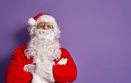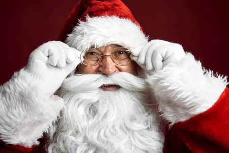 Portrait of Santa Claus in red coat and eyeglasses on blurred background