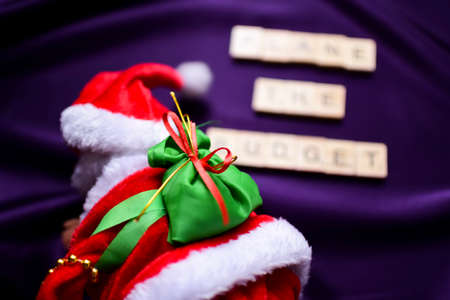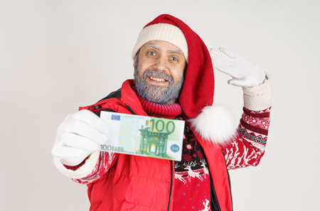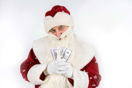 New Year and Christmas concept. Santa Claus holds money in his hands. Isolated on light background