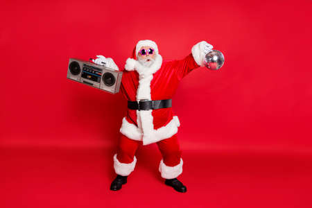 Full body photo of carefree careless fooling mad wild star dancer dancing having fun cool santa grandfather enjoying vacation time isolated bright background