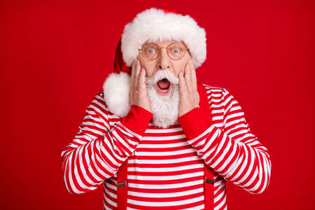 Photo of retired grandpa open mouth palms cheekbones terrified look miss newyear deadline wear santa costume suspenders spectacles striped shirt headwear isolated red color background