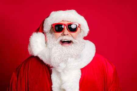 Closeup portrait photo of retired old man grey beard open mouth cheerful smiling make wish newyear eve family holiday wear santa costume sunglass headwear isolated red color background