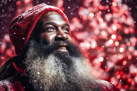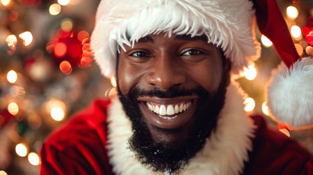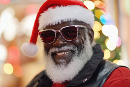 African American man with beard wearing Santa hat and glasses in front of festive lights. Concept of Christmas, holiday season, festive mood, winter celebration.