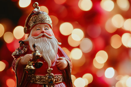 A detailed Santa Claus figurine stands proudly in front of a colorful bokeh background symbolizing the holiday spirit and joy.