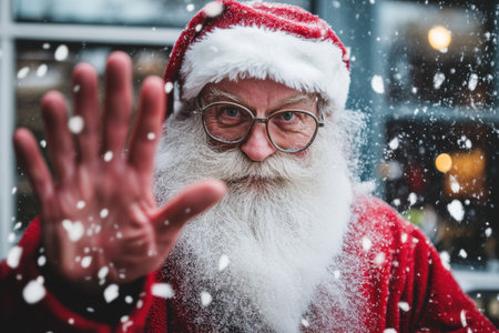A cheerful Santa Claus stands in falling snow greeting with a joyful wave and a warm smile amid a festive atmosphere.