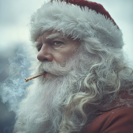 A man dressed as Santa Claus pauses to enjoy a cigarette while snowy scenery surrounds him during the Christmas season.