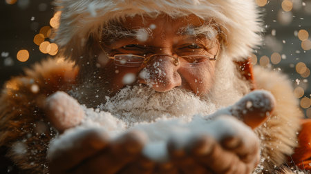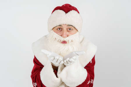 Santa claus blowing snow close up festive gesture for new year celebration on solid background