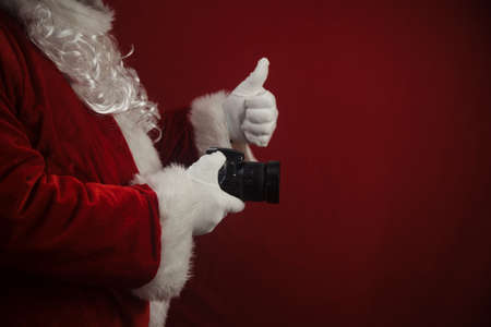 Santa Claus using DSLR camera taking images showing thumb up. Happy Christmas Evening and New Year celebration background. Fun loving creative costume time