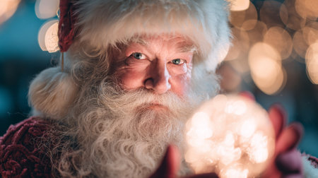 A joyful elderly man dressed as Santa Claus holds a glowing orb, radiating warmth and festive spirit. Surrounded by twinkling lights, he embodies holiday magic.