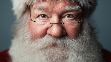 Close up portrait of Santa Claus with long white beard wearing glasses and fur coat
