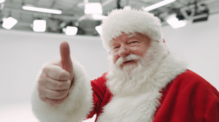 A joyful Santa Claus in a bright studio setting, giving a thumbs up gesture. This festive image captures the spirit of Christmas and holiday cheer.