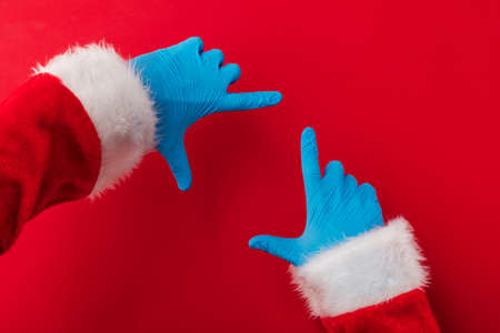 Santa hands wearing blue PPE protective gloves making frame with hands