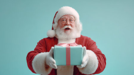 Santa Claus stands joyfully on a light blue background, holding a wrapped gift box with a pink ribbon, embodying the festive spirit of the holiday season.