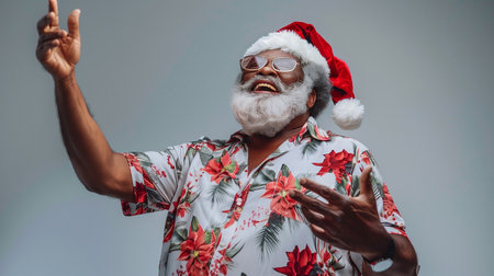 A joyful man dressed as Santa with sunglasses and a festive hat smiles brightly embodying holiday cheer in a vibrant setting.