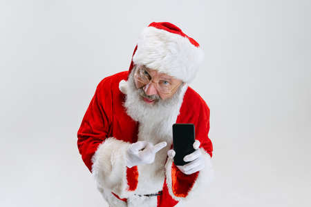 Cropped portrait of senior man wearing Santa Claus costume pointing at phone screen isolated over white background. Holiday notification