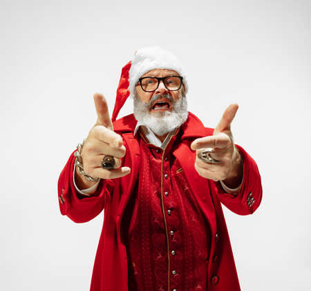 Thumbs up, cool. Modern stylish Santa Claus in red fashionable suit isolated on white background. Looks like a rockstar. New Year and Christmas eve, celebration, holidays, winters mood, fashion.