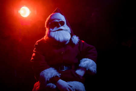 Santa claus in sunglasses in neon light on a black background. Christmas party.
