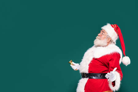 Portrait of a surprised Santa Claus with a gold bell on a green studio background. Christmas and New Year. Copy space.