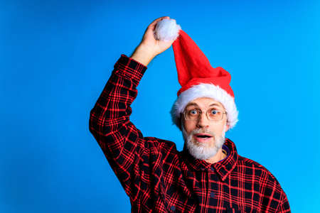 an elderly and well-groomed man in a plaid shirt and santa hat in blue studio background