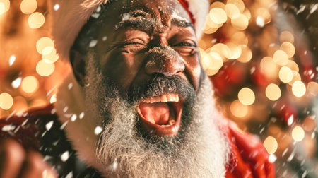 A gleeful dark-skinned Santa experiences pure joy as he tumbles down a snowy mountain, embracing the whimsical thrill of the moment.