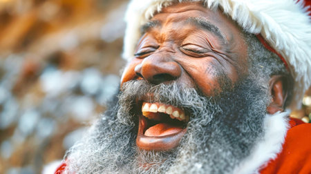 A cheerful dark-skinned Santa Claus slips down a snowy mountain, bursting into joyful laughter amidst a magical winter landscape.