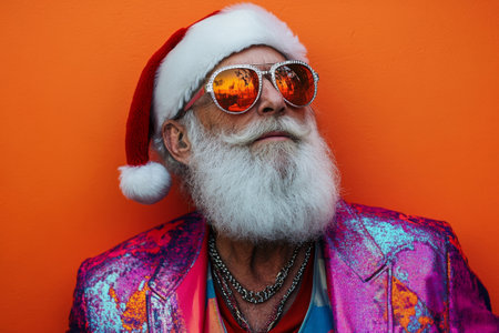 Stylish Santa Claus wearing sunglasses, Santa hat and vibrant colorful suit on orange background