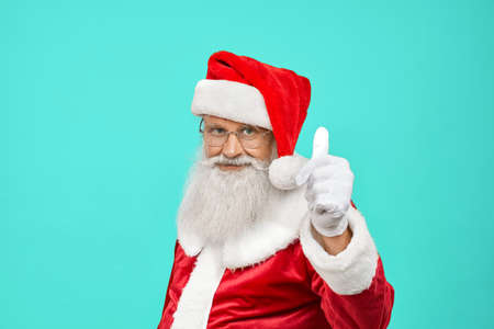 Front view of smiling Santa Claus with white beard showing thumb up. Isolated portrait of handsome senior man in christmas costume and glasses posing on blue studio background. Concept of holidays.